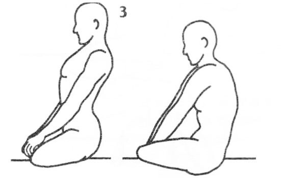5. Повороты головы. Сядьте на пятки; колени вместе, спина прямая; руки положите на переднюю поверхность бедер. Сделайте глубокий вдох: на вдохе поверните голову влево и мысленно произнесите «Сат». Затем сделайте полный выдох: на выдохе поверните голову вправо и мысленно произнесите «Нам». Продолжайте, ритмично чередуя вдохи и выдохи, 3 минуты. Затем вернитесь в центральное положение, сделайте вдох, расслабьтесь.