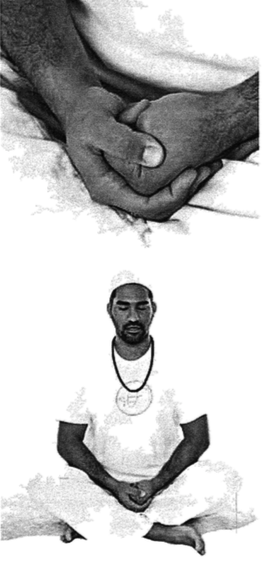 Мудра: Сложите левую руку в кулак, большой палец спрятан внутри кулака. Поддерживайте сильное, но не болезненное давление на большой палец. Обхватите пальцами правой руки левый кулак. Поместите большой палец на центр левого кулака, прижимая большой и остальные пальцы левой руки. Свободно положите мудру у низа живота, поддерживая пальцы крепко сжатыми во время всей медитации. Данная мудра - это тантра; это контролируемая комбинация полярности, которая действует, как семя, для того, чтобы ум успокоился и начал наблюдать сам себя.